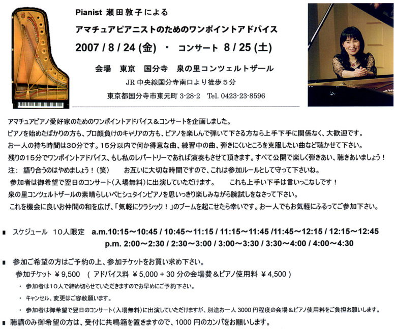 -------------------------------------------------------------------------- アマチュアピアニストによるコンサート(入場無料) 2007/8/25 (土) p.m. 1:00〜 ---> 変更 ---> 2007/8/24(金) p.m. 6:00〜 -------------------------------------------------------------------------- 2007/8/25 (土) p.m. 2:30〜 瀬田敦子トーク&コンサート 前売り券 \3.000 (当日券はありません) 〜 気軽にクラシック! 聴きたかった名曲を身近で 〜 「エリーゼの為に」「乙女の祈り」「トルコ行進曲」「子犬のワルツ」「ラ・カンパネラ」等 (小さなサロンですので前売り券販売のみとします。お早めにお申し込み下さい。 |